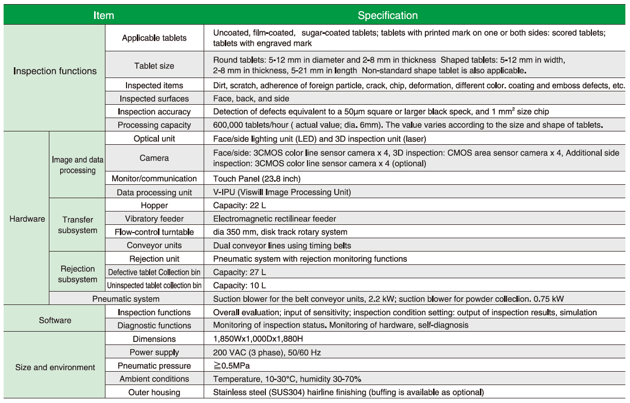 The many impressive features of this system include high-precision inspection 3D, color cameras and Improved emboss/printing inspection, stable tablet transfer via soft handling technology, tablet type changeover using automatic setups, and ease of disassembly to enhance cleaning efficiency.